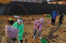 Дети убирают с прогулочных участков опавшие листья и мусор.