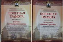 Награждением Почётной грамотой МКУ "УО" ИК ЕМР были удостоены воспитатель 1 квалификационной категории Гадельшина Фарида Харисовна и музыкальный работник, 1 квалификационной категории Исакова Светлана Николаевна. 1 квалификацион категорияле тәрбияче Гадельшина Фәридә Харис кызы һәм 1 квалификацион категорияле музыка тәрбиячесе Исакова Светлана Николай кызына 5 март көнне Мактау грамотасы тапшырылды.
