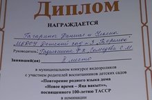 Воспитанники детского сада Гагарин Данил и Гагарина Ульяна под руководством воспитателей Гадельшиной Ф. Х. И Самедовой С. М. Участвовали в муниципальном конкурсе видеороликов с участием родителей воспитанников детского сада повторение родного языка дома "Новое время-Яңа вакыт" посвящённого 100 летию Татарстана в номинации "Играя познаем мир".