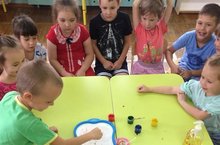 Шулай итеп, безгә эксперимент өчен нәрсә кирәк? Сөт, буяулар, савыт-саба юу чарасы, мамык таякчыклары, тәлинкә. Нәрсә була соң? Сөт хәрәкәт итә башлый, ә төстәге хәрәкәт итә башлый. Буяулар мамык таякчыгыннан « бии» башлый. Ә таякчыкны җыештырганда буяуларны « биергә»дәвам итәләр. Мондый экспериментны N10 нчы өлкән төркем балалары үткәрде. Балалар бик канәгать калдылар.