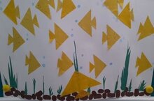 Очередное занятие по аппликации для воспитанников старшей группы началось необычно - воспитатель пригласила всех в подводное царство Аквариума! Ребята с любопытством рассматривали яркие иллюстрации с изображением декоративных рыбок, узнали много нового и интересного об их жизни. Так же вспоминали, где в природе встречаются рыбки, какой формы у них тело, чем оно покрыто, что помогает рыбкам плавать и чем они питаются. Воспитатель предложила ребятам сделать аппликацию «Аквариум с рыбками». После того, как все дружно повторили правила работы с ножницами (без разрешения воспитателя брать ножницы нельзя; - резать, держа концы лезвиями от себя; - при передаче ножниц держать их за острый край), ребята, засучив рукава, принялись за творческую работу. В ходе работы воспитатель юным «аквариумистам» напоминала, как правильно разделить пополам квадрат обращала внимание на аккуратность при работе с клеем. Развивать у детей чувство композиции, закреплять пространственные представления – учить правильно располагать изображения на основе, развивать воображение, внимательность, мелкую моторику рук, закреплять приемы вырезания и аккуратного наклеивания – стали основными задачами педагога. Ребята старательно расположили в аквариум свои рыбки, водоросли, камешки и ракушки. И вот какие чудесные композиции у них получились!