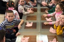 Затем музейное занятие переместилось в каминный зал, где прошла игра «Ситуативный этикет — накрой стол для друзей Шапокляк». Дети показали Шапокляк как нужно сервировать стол. После исправления ошибок при сервировке стола, ребятам предложили добавить к красиво накрытому столу ещё и салфетки. Но не просто положить салфетки, а сделать из них красивые цветы. Когда дети научились делать цветки лилии из салфеток, Шапокляк предложила украсить ими стол. Получилось очень красиво!