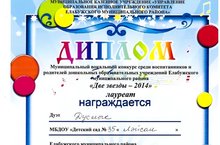 Конкурс "Две звезды" 28.10.2014 В доме культуры “Колос” состоялся вокальный конкурс “Две звезды” с участием родителей и воспитанников детских садов. В этом конкурсе наш детский сад представили две пары. Дуэт "Дуслык" получил диплом Лауреата. Все получили удовольствие от этого конкурса. Поздравляем наших участников! Мы Вами гордимся!!!