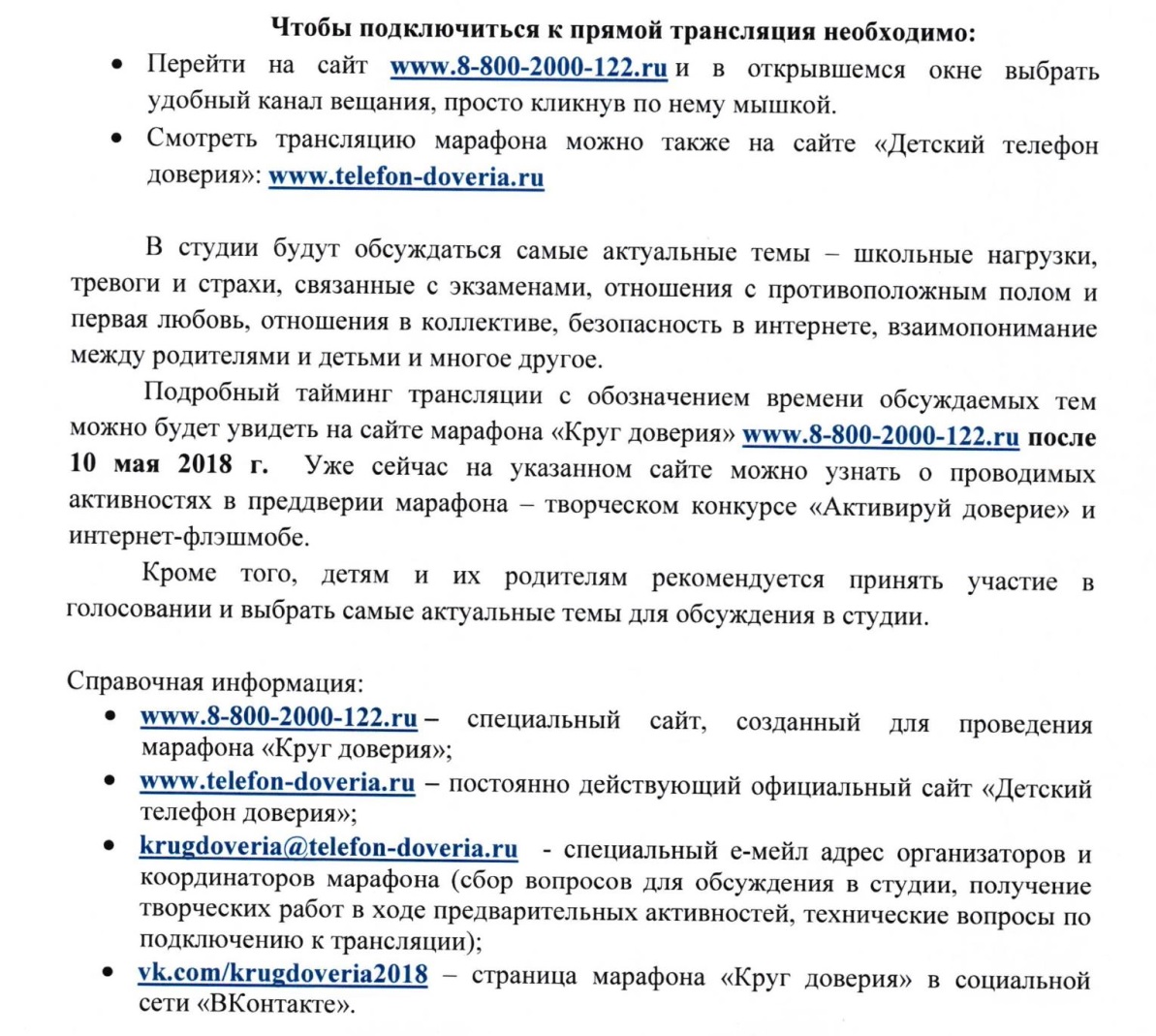 17 мая - международный день Детского телефона доверия. Именно в этот день Фонд поддержки детей, находящихся в трудной жизненной ситуации, проведет мероприятие - он-лайн марафон "Круг доверия", направленный на повышение узнаваемости Детского телефона доверия и принципов его работе.