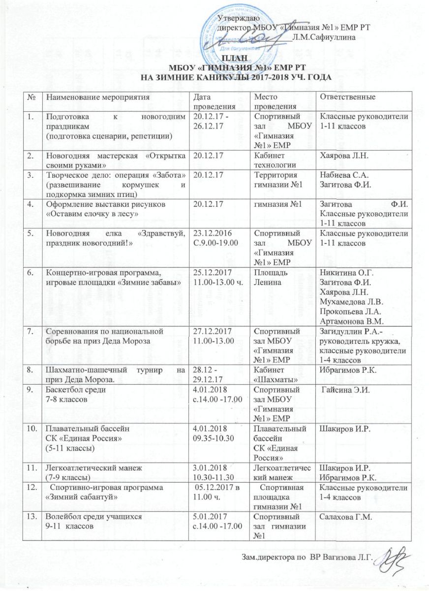 План работы на зимние каникулы 21.12.2017
