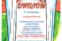 От всей души поздравляем театральный коллектив "Асылташ" под руководством Низамовой Наили Бизяновны, занявший 1 место в Третьем муниципальном конкуре театральных коллективов "Весь мир-театр 2015" в номинации "Спектакль 7-10 лет".