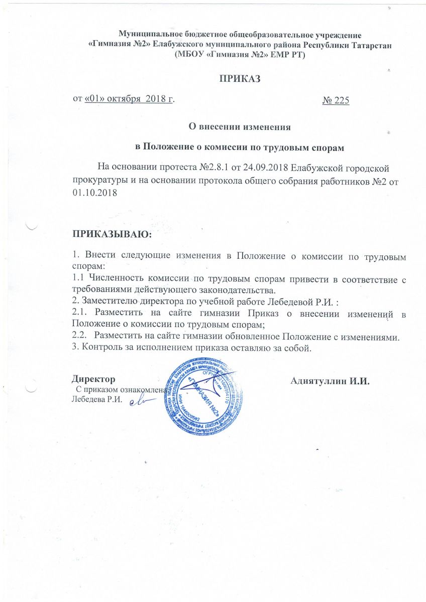 Приказ о внесении изменения в Положение о комиссии по трудовым спорам
