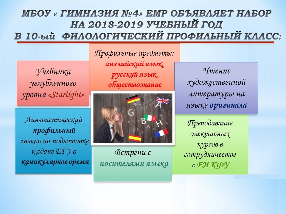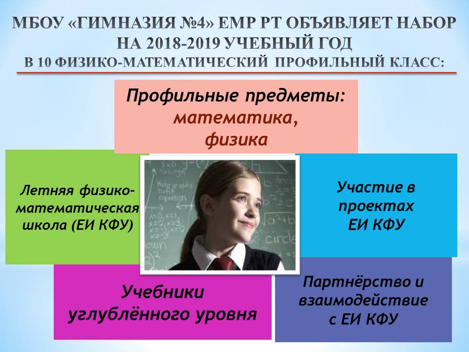 МБОУ «Гимназия №4» ЕМР РТ объявляет набор и приём заявлений в 10-ые профильные классы: