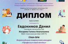 Евдокимов Данил, ученик 3 класса получил ГРАН-ПРИ Всероссийского творческого конкурса "Профессия моей мечты". Задачей конкурса являлось развитие фантазии, воображения, творческой активности, воспитание в детях любви к творчеству, красоте, искусству, стимулирование познавательных интересов.