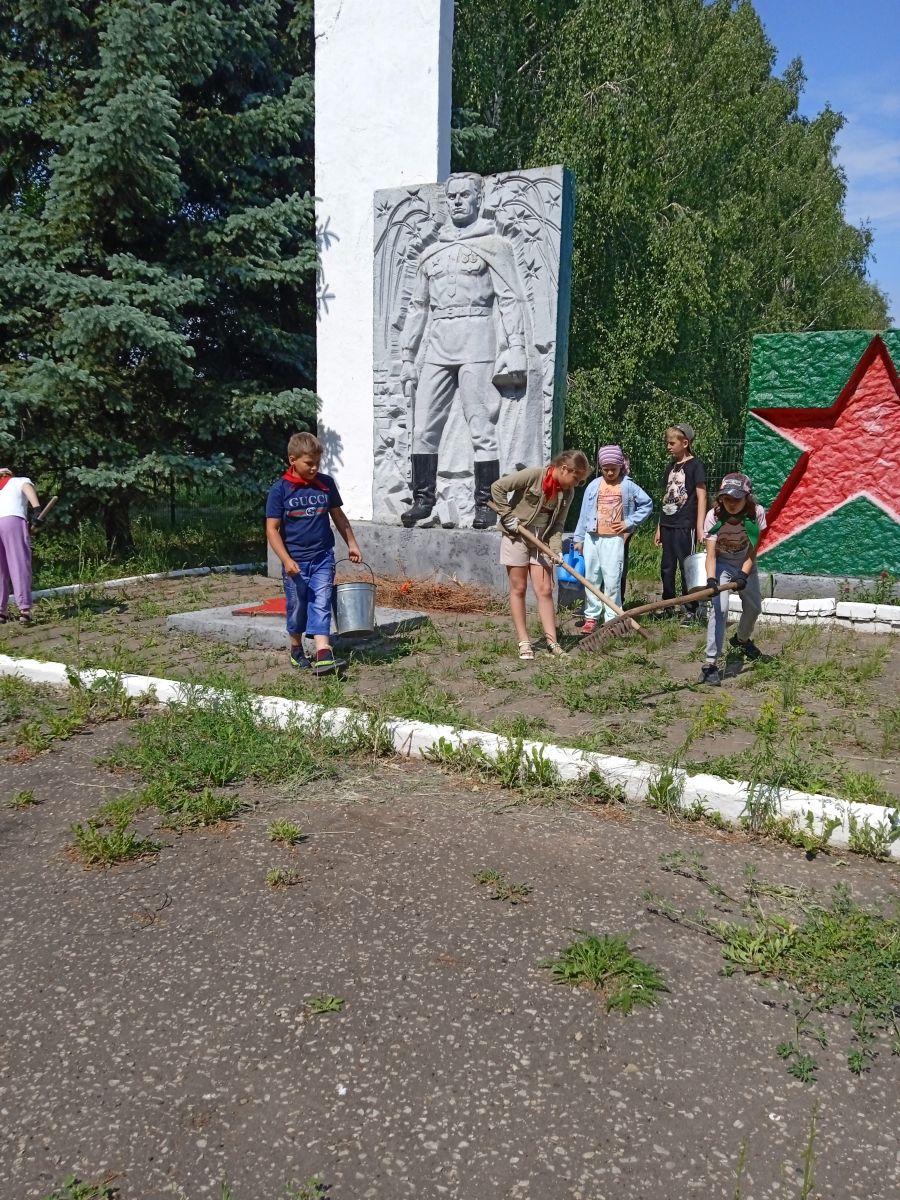 Трудовая бригада лагеря очистила территорию около памятника от травы./Лагерьның хезмәт бригадасы һәйкәл янындагы территорияне үләннән чистартты. -