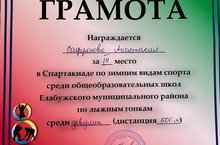 В деревне Старые Юраши прошла спартакиада по зимним видам спорта среди школ нашего района, посвященная 100 летию образования ТАССР. Ученица пятого класса нашей школы Сафронова Анастасия заняла почетное третье место в лыжных гонках среди девушек на дистанции 500 метров./Иске Юраш авылында кышкы спорт төрләре буенча спартакиада булып узды.