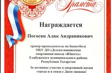 За активное участие в спортивной жизни города и в связи с Днём тренера почётной грамотой награжден тренер - преподаватель по баскетболу Погосян А.А./Шәһәрнең спорт тормышында актив катнашканы өчен һәм тренер көне уңаеннан Мактау грамотасы белән баскетбол буенча тренер - укытучы А. А. Погосян бүләкләнде.