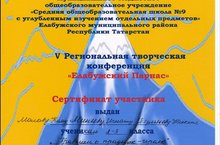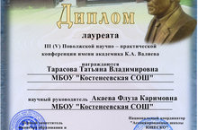 Научно-практическая конференция в г.Мамадыш 17.03.2018 Ученица 10 класса Тарасова Т. и руководитель Акаева Ф.К.участвовали в III(V)Поволжской научно-практической конференции имени академика К.А.Валиева и получили диплом лауреата.