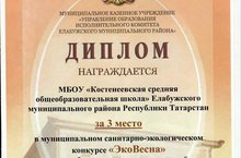 ЭкоВесна 31.08.2017 В муниципальном санитарно-экологическом конкурсе "ЭкоВесна" среди образовательных организаций Елабужского муниципального района в номинации "ЭкоШкола" в секции "Лучший экопроект" наша школа заняла 3 место.