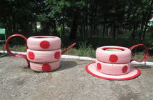 Так и в нашем дворе поселилось яркое солнышко, замечательные веселые зайчики, пингвины, хрюшки и яркая зеленая лягушка. И все это - клумбы для прекрасных ярких цветов. Наш замечательный педагог, учитель физкультуры и просто прекрасная и трудолюбивая девушка Земфира Камиловна Сафина творит эту красоту своими руками. При этом здорово то, что для своих поделок она использует старые покрышки, пластиковые бутылки, майонезные ведерки и даже галоши и старые резиновые сапоги. В общем, дает вторую жизнь старым вещам.