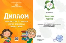 Ученица 2 класса Карина Хачатрян приняла участие в дистанционных олимпиадах Международного проекта INTOLIMP.ORG и получила диплом І степени по окружающему миру и ІІ степени по русскому языку и математике. Поздравляем Карину! -