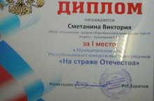 Учащиеся нашей школы приняли участие в муниципальном этапе Республиканского конкурса-выставки рисунков «На страже Отечества». Сметанина Виктория (руководитель Кашеварова Е.А.) награждена дипломом І степени. Поздравляем Викторию с победой!