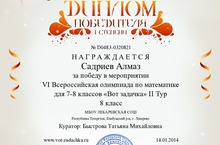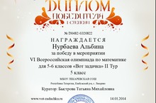 с победой во Всероссийской дистанционной олимпиаде по математике «Вот задачка», которая проводилась с 28.10.2013 по 14.01.2014 г. Центром развития мышления и интеллекта. Учитель Быстрова Татьяна Михайловна.