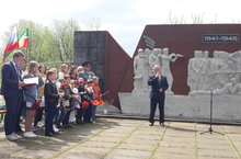 В школе все учащиеся с желанием участвуют в акции «Георгиевская ленточка». Эта лента черно-оранжевого цвета является одним из главных атрибутов Дня Победы в Великой Отечественной войне – одного из наиболее уважаемых праздников в нашей стране./ Мәктәптә барлык укучылар да «Георгий тасмасы» акциясендә теләп катнашалар. Кара-кызгылт сары төстәге әлеге тасма Бөек Ватан сугышында Җиңү көненең төп атрибутларыннан берсе - илебездә иң хөрмәтле бәйрәмнәрнең берсе.