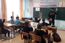 Сегодня с учащимися начальных классов прошла встреча-беседа по безопасности дорожного движения с инспекторами ДПС г.Елабуга. Задавали вопросы, проверяли световозвращающие элементы, раздали памятки юного пешехода. / Бүген башлангыч сыйныф укучылары белән Юл хәрәкәте иминлеге буенча Алабуга шәһәре юл-патруль хезмәте инспекторлары белән очрашу-әңгәмә узды. Сораулар бирделәр, яктылыкны кире кайтаручы элементлар тикшерделәр, яшь җәяүлегә белешмәлекләр тараттылар.