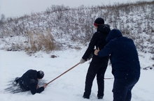 Толщина льда 15 см, достаточно для безопасного передвижения по льду. Набрав дистанцию более 7 метров, учащиеся успешно преодолели Лекаревский малый пруд. Также провели практическую учёбу о помощи в зимнее время попавшему в воду человеку./ Боз буенча куркынычсыз хәрәкәт итү өчен, боз калынлыгы 15 см булырга тиеш . 7 метрдан артык араны, укучылар Лекарево кече буасын уңышлы үттеләр. Шулай ук кышкы вакытта суга эләккән кешегә ярдәм итү турында практик укулар үткәрделәр.