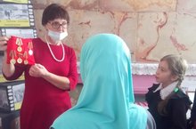 В школьном музее состоялся урок для учащихся 3 и 4 классов «Герои Отечества-наши земляки». Руководитель музея Яркова Н.В. провела беседу, рассказала о жителях села Лекарево, награжденных орденами и медалями в годы Великой Отечественной войны. / Мәктәп музеенда 3 һәм 4 сыйныф укучылары өчен «Ватан геройлары-безнең якташлар»дигән дәрес узды. Музей җитәкчесе Яркова Н. В.әңгәмә үткәрде, Лекарево авылында яшәүчеләр, Бөек Ватан сугышы елларында орденнар һәм медальләр белән бүләкләнгән кешеләр турында сөйләде.