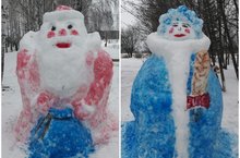 Учащиеся школы участвовали в конкурсе снежных скульптур. Слепили Деда Мороза, Снегурочку, старый год — Хрюшку и новый год — Мышку. Теперь фигурки радуют двор нашей школы./ Мәктәп укучылары кар сыннары конкурсында катнаштылар. Кыш Бабай, Кар кызы, иске ел — дуңгыз һәм Яңа ел — тычканны ясадылар. Хәзер сыннар безнең мәктәпнең ишегалдын сөендерә. -
