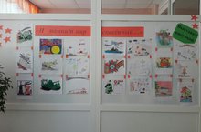 На втором этаже школы оформлена выставка рисунков "И помнит мир спасенный...", посвященная 74-годовщине Победы. /Мәктәпнең икенче катында " Җиңгән дөньяны хәтерли..."дип исемләнгән Җиңүнең 74 еллыгына багышланган рәсем күргәзмәсе оештырылды. -