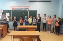 С учащимися 1-7 классов прошла встреча с директором клуба с.Лекарево. Она познакомила учащихся с различными музыкальными инструментами: курай, баян, гармонь и т.д. Попытались на песню "Катюша" поиграть на инструментах. Учащиеся изъявили желание научиться играть. / 1-7 сыйныф укучылары белән Лекарево җирлегенең клуб мөдире белән очрашу узды. Ул укучыларны төрле музыка кораллары белән таныштырды: курай, баян, гармун һәм башкалар... Укучылар уйнарга өйрәнергә теләк белдерделәр. -
