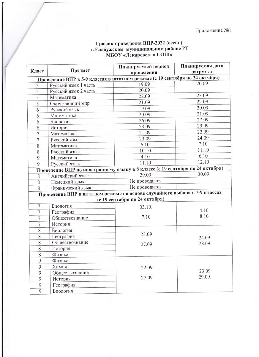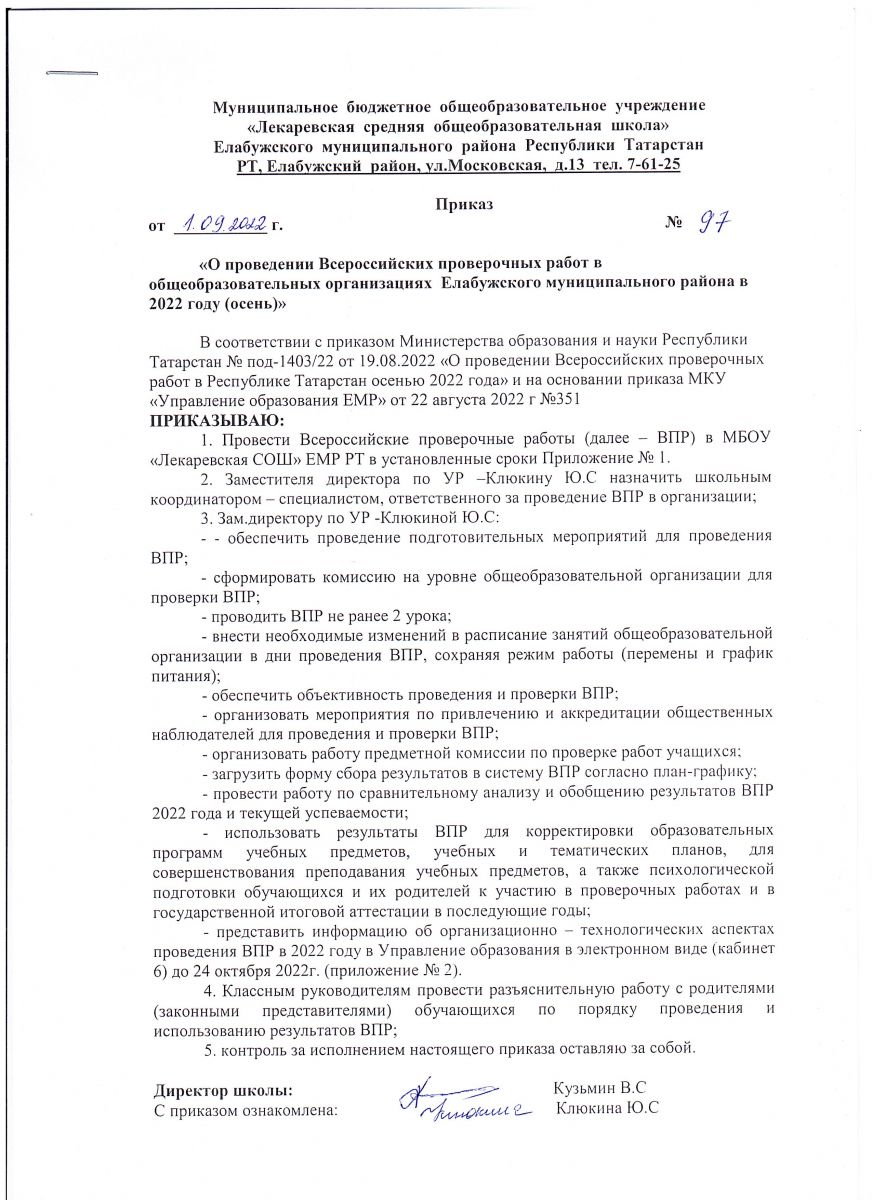Приказ МБОУ "Лекаревская СОШ" ЕМР РТ о проведении ВПР в 2022 г