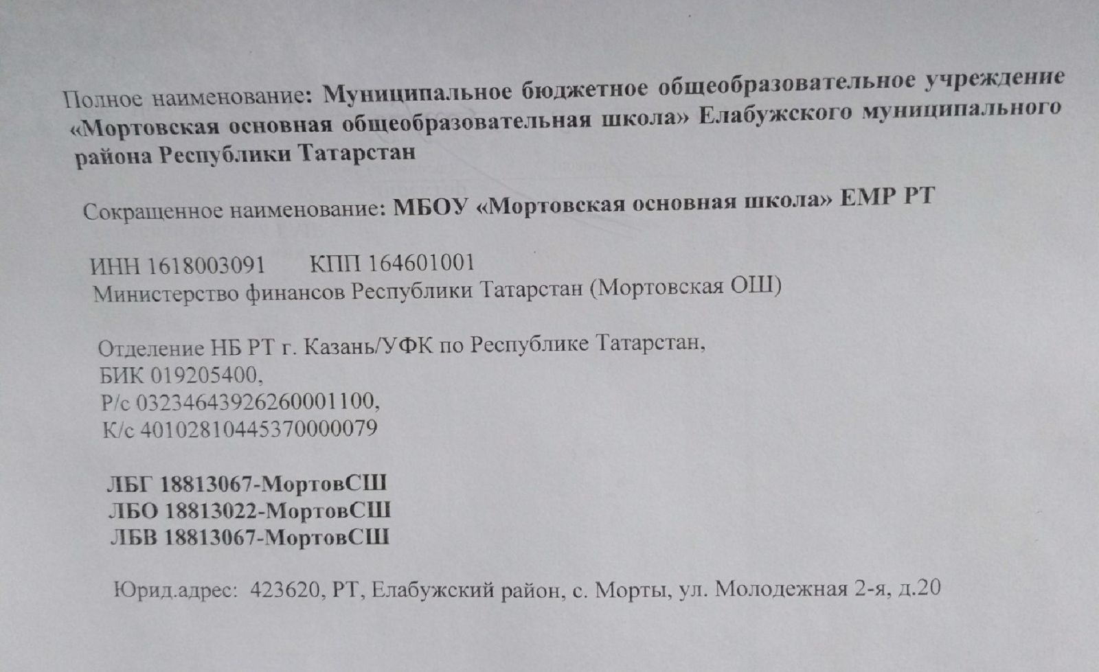 Муниципальное бюджетное общеобразовательное учреждение "Мортовская основная общеобразовательная школа" Елабужского муниципального района Республики Татарстан/Татарстан Республикасы Алабуга муниципаль районының муниципаль бюджет гомуми белем бирү учреждениесе “Морт төп гомуми белем бирү мәктәбе”