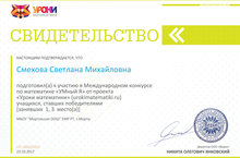 Международный конкурс "УМный Я" от проекта "Уроки математики" (urokmatematiki.ru). Наши победители: Смехов Никита (8 кл), Сафина Ильвина (5кл) - 1 место, Хузин Айдар (5кл) - 3 место. Учитель: Смехова Светлана Михайловна.