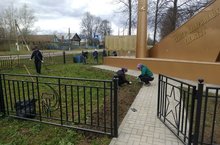 "Ватан өчен һәлак булган авылдашларга" куелган обелискны җыештыру.