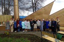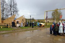 "Ватан өчен һәлак булган авылдашларга!" куелган обелиск янында митинг.