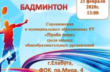 21 февраля 2020 года в г. Елабуга прошли Республиканские соревнования по бадминтону «Проба пера» среди обучающихся общеобразовательных организаций. В соревнованиях приняли участие 70 учеников из СОШ № 3, 10, 1, 8, 6, гимназия 4 и 1 «Центр национального образования». Соревнования проходили в трех возрастных категориях.