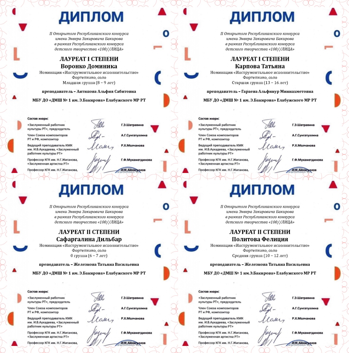Опубликовано: 30.10.202328 октября в Казани прошёл Республиканский конкурс имени Энвера Бакирова в рамках Республиканского проекта «100 лица». Достойно представили Елабугу воспитанницы ДМШ 1 им. Э. Бакирова Татьяна Карпова, Доминика Воронко, Дильбар Сафаргалина, Фелиция Политова. Елабужанки стали Лауреатами 1 и 2 степеней, завоевав высокие баллы жюри, председателем которого была дочь Энвера Бакирова - Гульнара Шатравина. Победа в этой конкурсе стала особенно почетной, так как школа носит имя Энвера Бакирова, - первого директора ДМШ 1