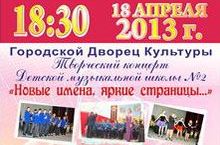 18 апреля 2013 г. в Городском дворце культуры состоится творческий концерт Детской музыкальной школы № 2 "Новые имена, яркие страницы..."