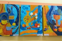 Выставка работ обучающихся 2-А класса ДХШ №1 им. И. И. Шишкина на тему: "Ритмичный натюрморт в контрастной сине-оранжевой цветовой гамме". Данные натюрморты - результат освоения учебной темы "Ритм в изобразительном искусстве" в рамках предмета "Композиция станковая". Выполнены рисунки в технике гуашевой живописи на тонированной бумаге. Преподаватель Архипова С.Г.