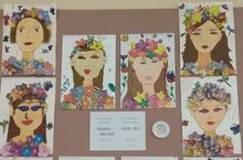 Халыкара хатын-кызлар көненә багышланган А1 класс укучыларының эшләре күргәзмәсе (укытучы Архипова С.Г.) Эшләр катнаш техникада гуаш белән башкарылган, күләмле аппликация өстәлгән.