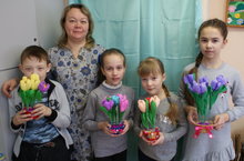 В ДХШ №2 прошел мастер-класс для учащихся Б2, Б4 классов "Подарок для мамы". Преподаватель Хатипова Гульнара Кабировна научила детей делать объёмные цветы из креп бумаги.