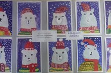 Северный мишка в шапочке и шарфе смотрит умными глазками с рисунков учащихся подготовительного класса (8 лет, преподаватель Хатипова Гульнара Кабировна). Выставка рисунков оформлена на 4 этаже школы.
