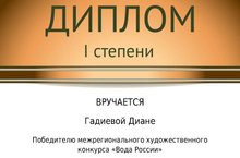 Приокско-Террасный заповедник в период с 21 февраля по 15 мая 2017 года проводил межрегиональный художественный конкурс «Вода России». От ДХШ №2 в конкурсе приняли участие 22 участника. Поздравляем наших победителей и желаем им успехов и замечательных работ: Дети от 7 до 10 лет: Диплом 2 степени Хакимова Аида, Диплом 3 степени Усова Элина