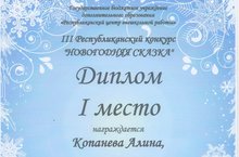 Поздравляем с победой в III Республиканском конкурсе "Новогодняя сказка" - 1 место, Копаневу Алину (преподаватель Нургалиев Рафик Шагитович)