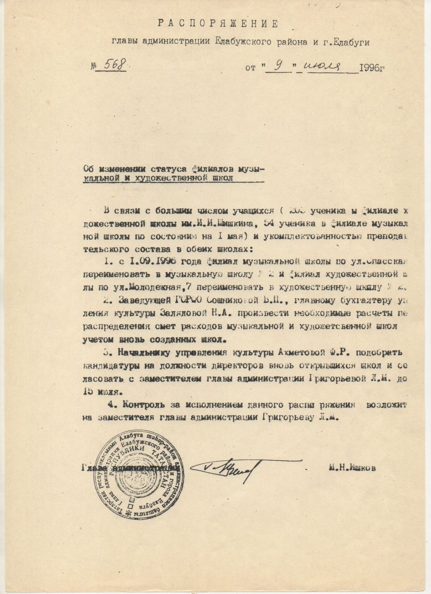 Распоряжение главы администрации Елабужского района и г.Елабуги №568 от 09.07.1996г.