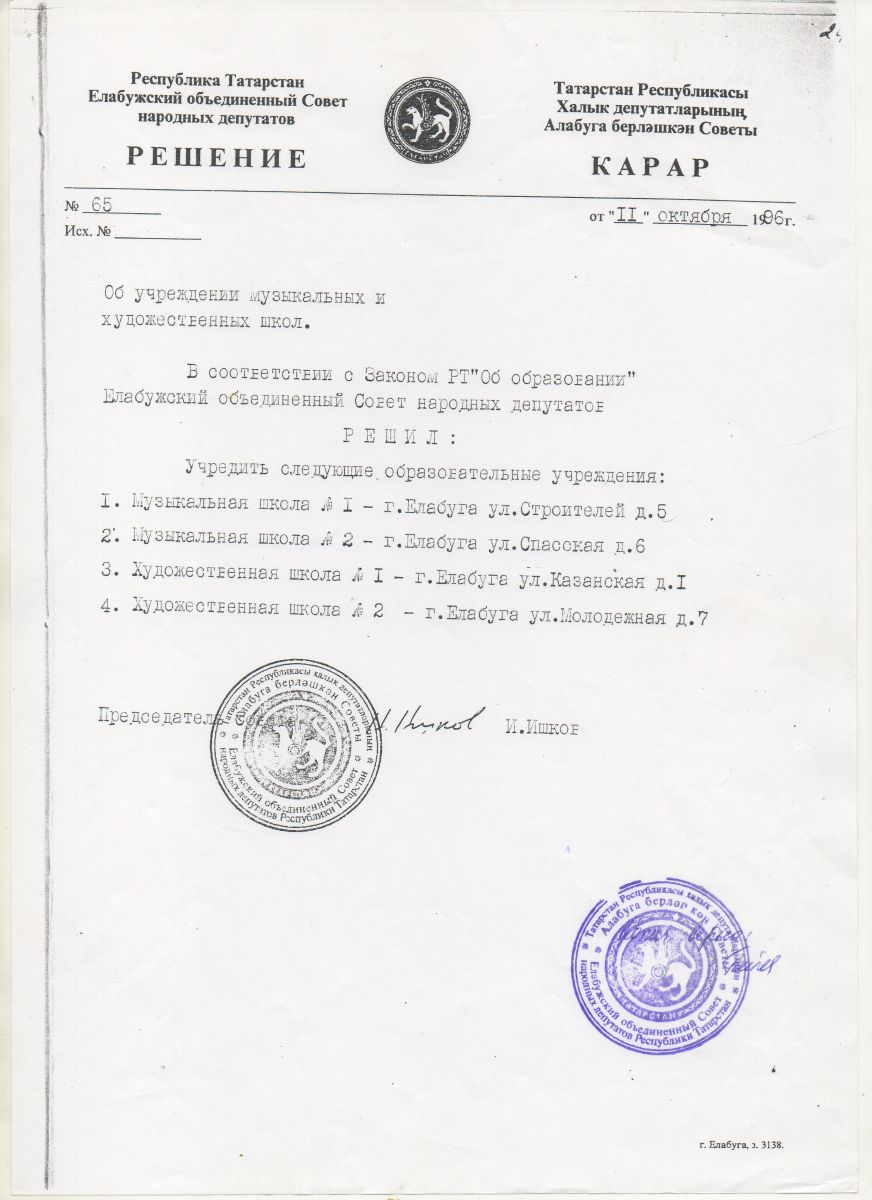 Решение об учреждении музыкальных и художественных школ №65 от 11.10.1996г.