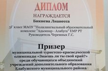 Бикиева Лианесса стала призёром муниципальной туристко-краеведческой олимпиады "Знаешь ли ты свой край?"