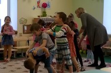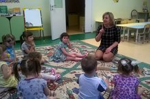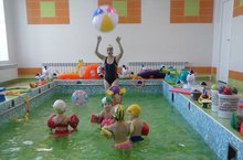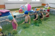 Воспитанники 3 - 4 лет, надев ласты, в чаше бассейна (озера) на несколько минут погрузились в пение легушат "Ква-ква-ква!".