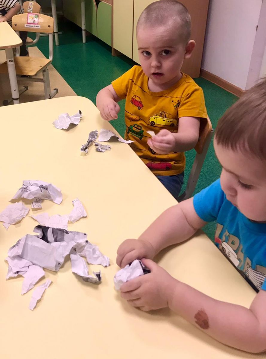 На кружке « Ловкие пальчики» дети ясельной группы учились рвать бумагу для того, чтобы засыпать берлогу косолапому мишке и от этого ему стало теплее.