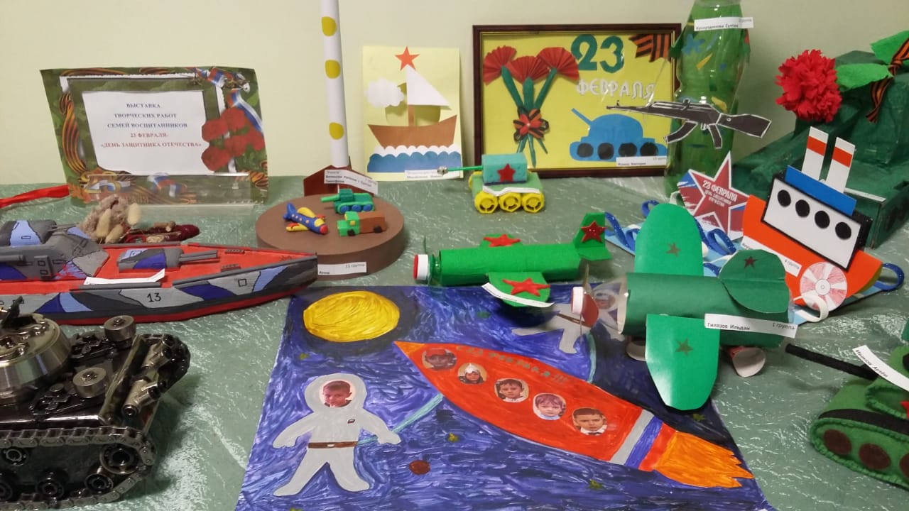 Ватанны саклаучылар көне алдыннан безнең балалар бакчасында гаилә иҗат эшләре күргәзмәсе оештырылды. Тәрбияләнүчеләр ата-аналар белән бергә төрле эшләнмәләр, рәсемнәр, макетлар тәкъдим иттеләр. Барлык ир-атларны бәйрәм белән котлыйбыз!