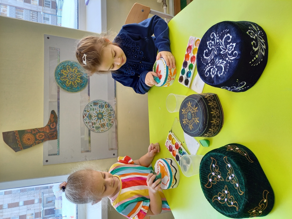 Для развития воображения и художественного творчества важно, чтобы ребёнок был знаком с разнообразными изобразительными материалами и средствами. Поролоновая губка - прекрасное средство для детского рисования. в группе №13 " Сказка" на кружке по нетрадиционной технике рисования" Весёлая акварелька" , ребята украшали предмет национального костюма- тюбетейку, паролоновой губкой.